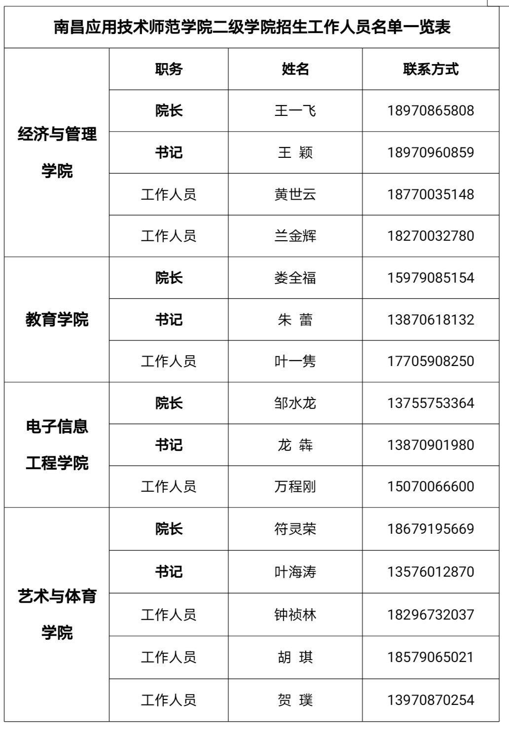 首页栏目 招生动态 通知公告 校园风光 支部建设 您现在的位置是:首页 > 首页栏目 > 通知公告 我校二级学院招生工作人员名单 管理员2021-08-092420 上一篇 2021年本科学费(调减)公告 下一篇 关于做好江西省2026年普通高校专升本考试报名工作的通知